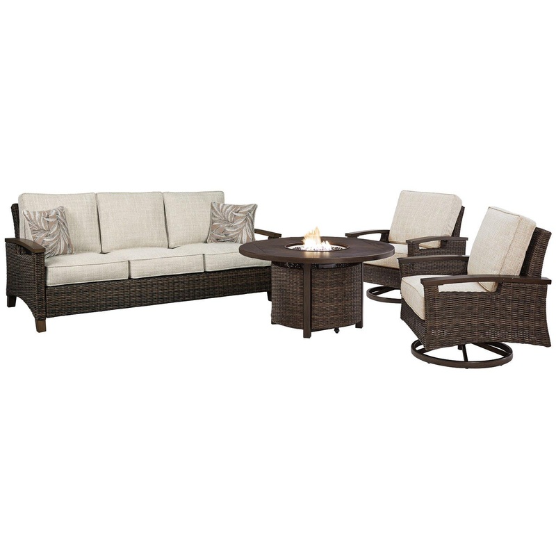 Pretty enough for trendy interiors, yet durable enough to weather the elements, this outdoor package rises to the challenge beautifully. Handwoven resin wicker over rust-free aluminum merges high style with low maintenance. Rest assured: Despite the wood look, the set’s sturdy aluminum construction is perfectly suited for alfresco living. Plush seat cushions, wrapped in high-performing Nuvella fabric, aim to please. To top it off, with the press of a button on the fire pit table you can ignite a flickering flame that dances over a bed of glass beads. And with plenty of spots to sit and comfortably chill by the fire, this is one highly accommodating outdoor furniture package.