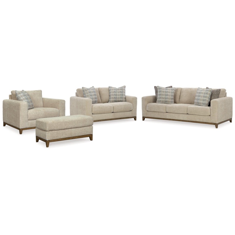 Serene style with a modern sensibility. Delight in the cozy, versatile embrace of this seating package. It takes an on-trend approach to irresistible texture and natural beauty, showcasing soft neutral upholstery accented with a transitional wood trim. As