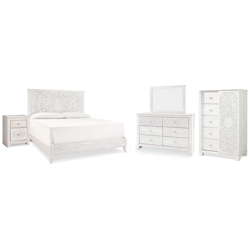 Showcase your trend-setting spirit with this bedroom package. Inspired by bohemian tapestries, the featured carved medallion patterns are a testament to boho-chic style. A whitewash finish on the various elements sets the foundation for a room bursting with personality, while USB device charging on the nightstand keeps you up to speed with a high-tech lifestyle.
