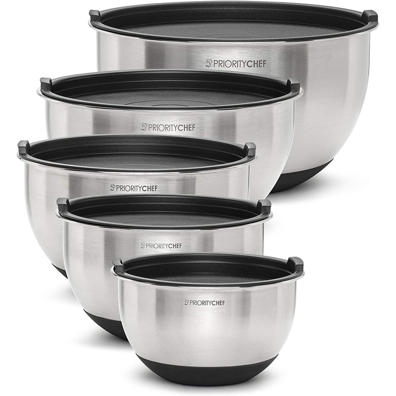 Priority Chef Premium Mixing Bowls With Lids Set, Thicker Stainless Steel Mixing Bowl Set, Large Prep Metal Bowls with Lids, Nesting Bowls for Kitchen, 1.5/2/3/4/5 Qrt, Black
