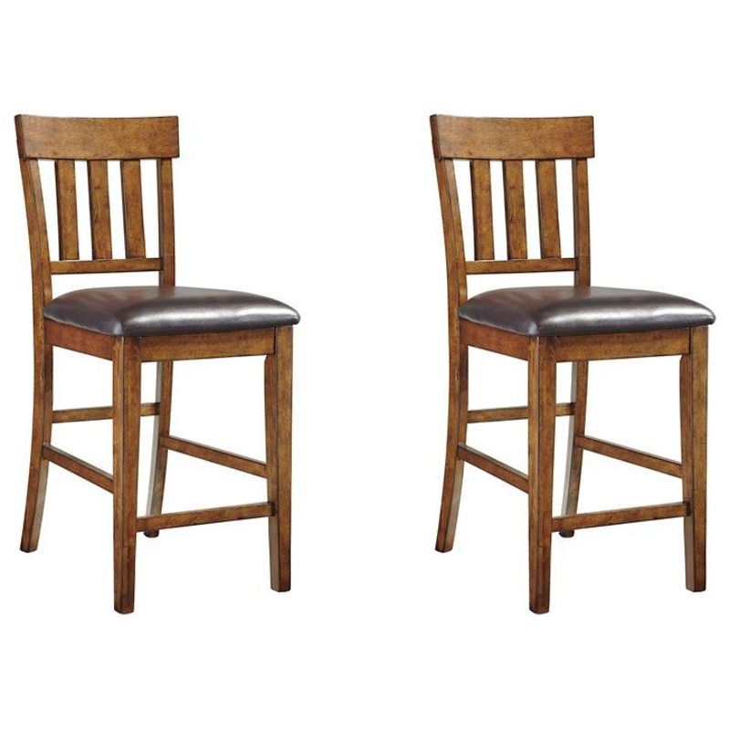 Sleek lines and comfortable cushioning combine to make this upholstered bar stool the favorite seat at the table. Traditional shaker design is given a vintage treatment with the rustic, burnished finish. Faux leather upholstery easily wipes clean.