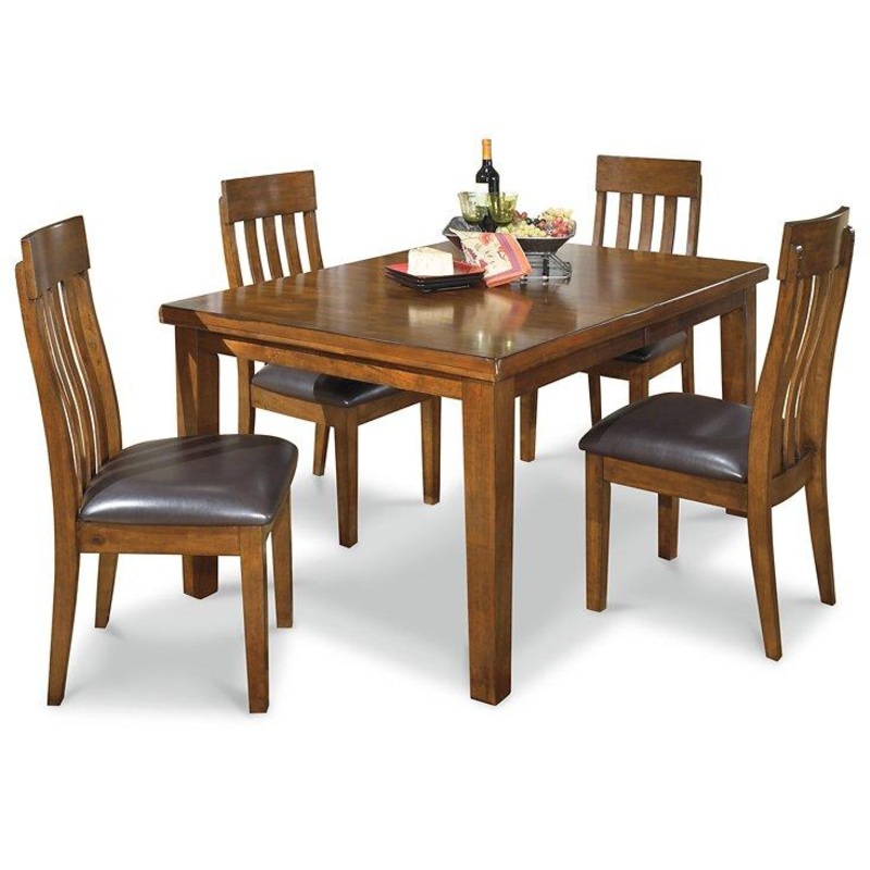 Have an appetite for clean-lined design, but with warmth and rustic character? Satisfaction is served with this dining room set. We love how its gently distressed, burnished finish and plank-style accents incorporate depth and character. And its straightforward lines? A wonderful display of good taste. The plushly upholstered faux leather seating makes sitting down to dinner that much more enticing. Makes for easy cleanup, too.