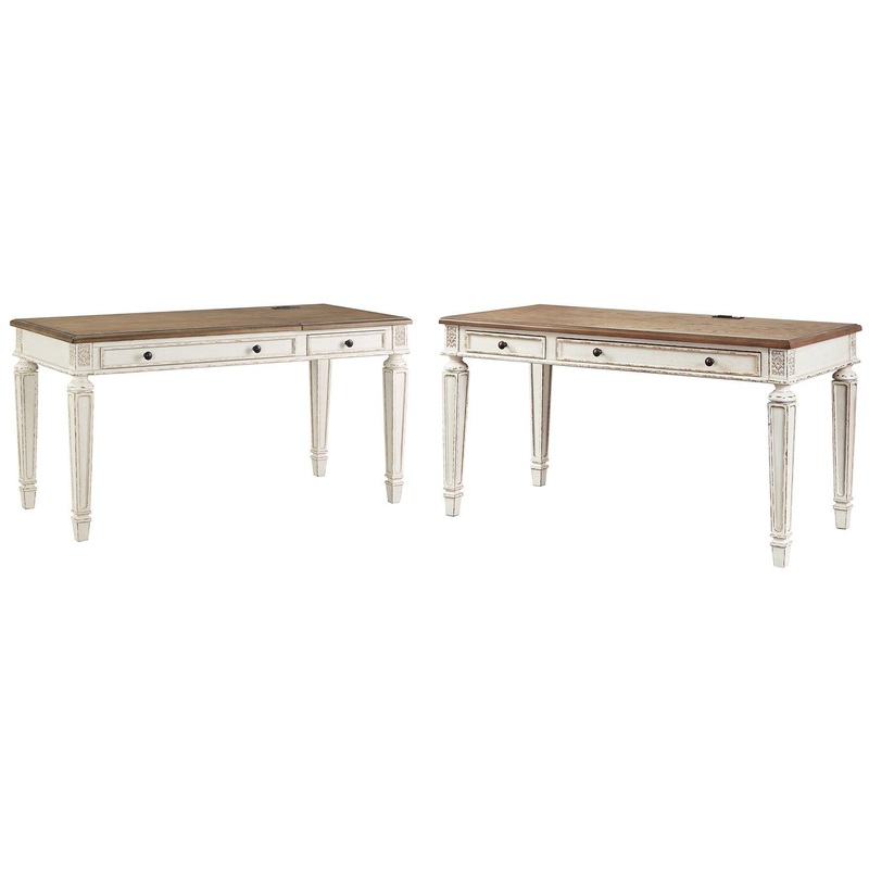 Elevating the art of traditional cottage styling, this desk set duo is your heavenly home office realized. Antiqued two-tone aesthetic blends a chipped white with a distressed wood tone top for added charm. Framed drawer fronts, decorative corbels and eleg