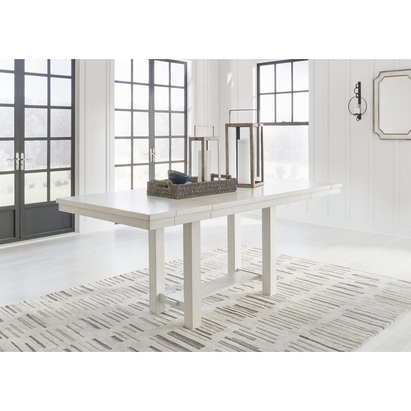 This counter height dining table is sure to impress come mealtime. With its antiqued white finish and a planked effect tabletop that extends for additional seating, farmhouse-style dining has never been so fashionable. All thats missing is you and your family.