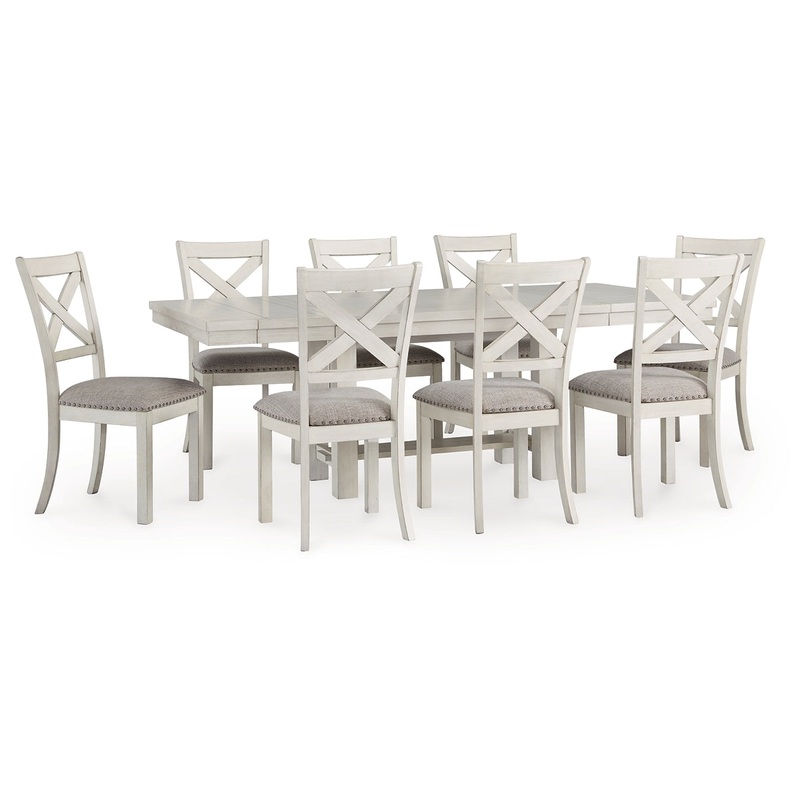| Details | D642-01: Made with solid wood frame, Antiqued white finish with grain texture, Light gray polyester upholstery, Nailhead trim, X-back, Assembly required, D642-45: Made with rubberwood solids, ash veneer and MDF substrates, Antiqued white finish with grain texture, Tabletop with planked effect, Two 12″ removable center leaves, Table extends to 86″ overall by pulling both ends and dropping in leaves, Seats up to 8, Assembly required, |