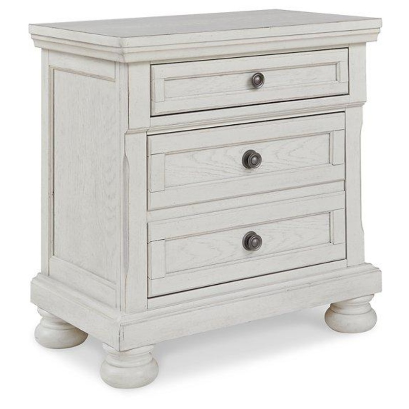 Elegant, timeless furnishings take your bedroom to the next level. Nothing does that better than this nightstand. The antiqued white finish with a wonderful grain texture radiates sophistication, while the dark bronze-tone hardware adds an ornate touch. A hidden pull-out tray behind the bottom drawer puts your small valuables out of sight. Felt finishing in the top drawer and a hidden pull-out tray rounds out the piece for the ultimate tasteful bedroom.