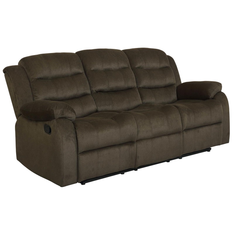 Incorporate comfort into a classic motif with this transitional motion sofa. Upholstered in durable velvet fabric, the plush seating is available in two-tone chocolate and tan. Plush and relaxing, the triple channeled back design and scoop seating offer am