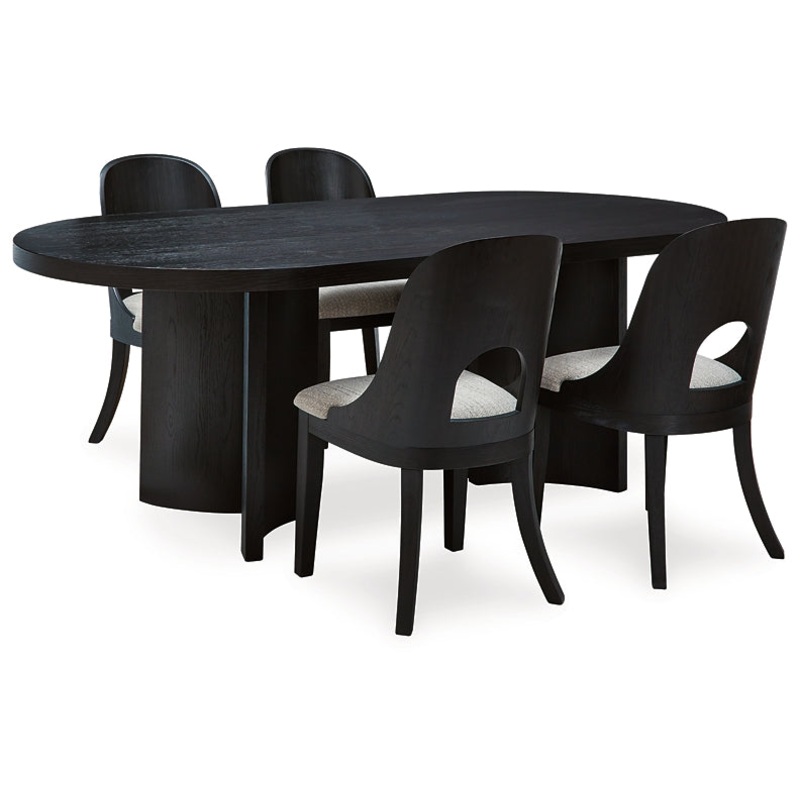 Inspired by art deco design, this dining package makes a lasting impression in a simply stunning way. Magnificent curved silhouettes are enhanced with a rich layered black finish and neutral upholstery. This set makes the contemporary statement youve been seeking to elevate late-night dinners and full-on family feasts.