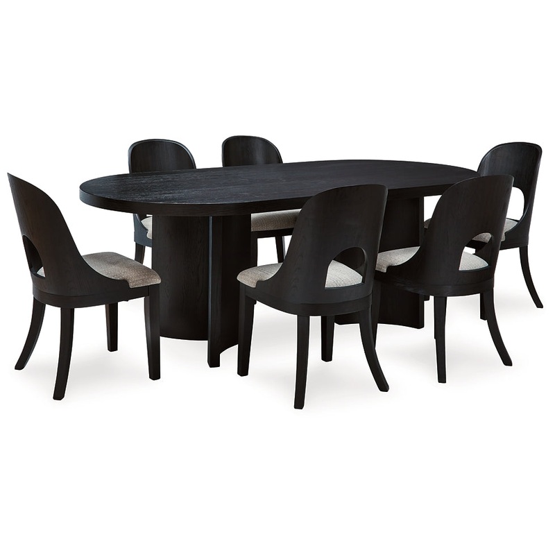 Inspired by art deco design, this dining package makes a lasting impression in a simply stunning way. Magnificent curved silhouettes are enhanced with a rich layered black finish and neutral upholstery. This set makes the contemporary statement youve been