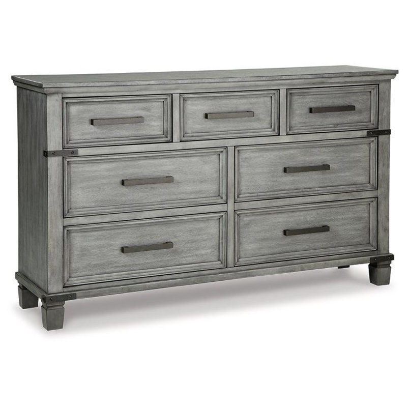 What's old is what's new with this dresser. Serving up a fresh look in urban farmhouse style, this eclectic piece features a light weathered gray finish with dark aged bronze-tone accents and metal straps for a casually cool sensibility. Profiled drawer fr