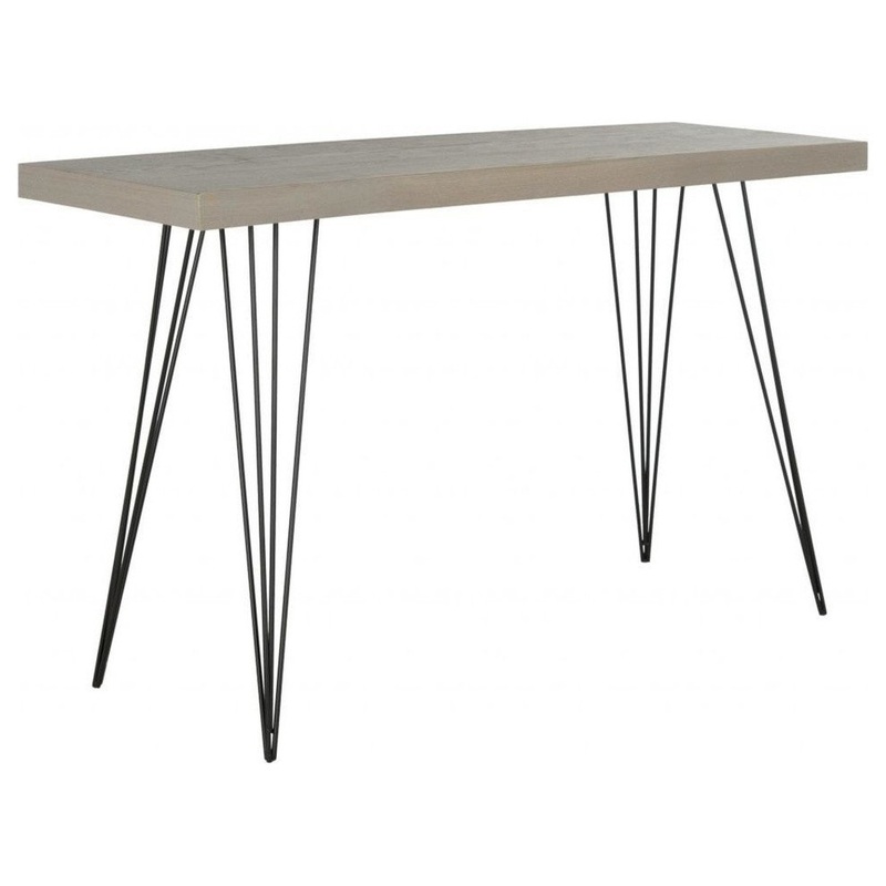 Sleek and contemporary, the Wolcott console table makes for a grand entrance in the front hall and a dramatic statement in any room. Its rustic-chic top of MDF with a Gray wood-grained finish appears to float on a base of hairpin-thin legs in black iron. C