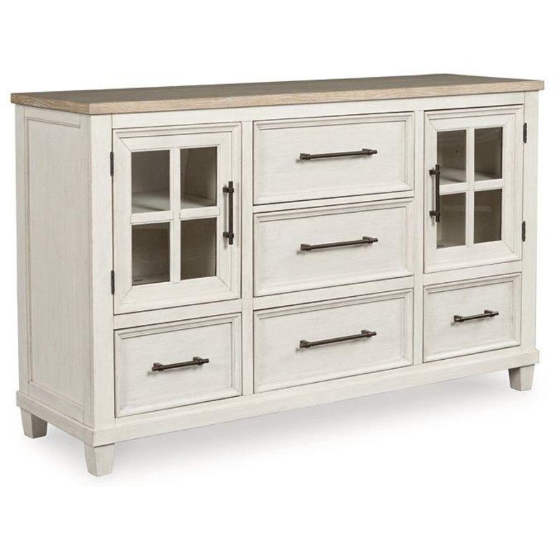 This dresser elevates the art of modern farmhouse design. Its two-tone aesthetic blends antiqued white and light grayish brown for a charming finish. Framed drawer fronts and windowpane cabinets lend a country feel. Conveying a feeling of relaxed comfort,