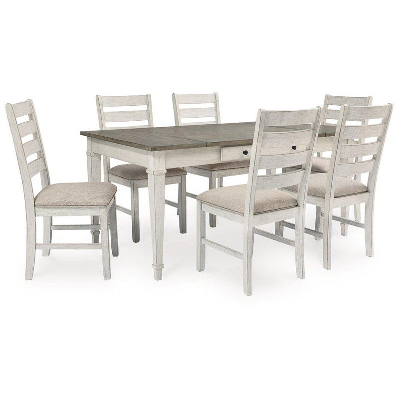 Set the scene for coastal chic or modern farmhouse living with this 7-piece dining room set. The clean-lined, simply striking table doubles the charm with its warm brown plank-effect top and grayish white base. Two convenient side drawers and a lift-top bin offer abundant storage options. Six upholstered, ladderback chairs sport a grayish white finish with rubbed through effect for a timeworn appeal.
