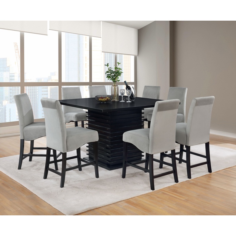 Rework a chic living space with a dynamic design that takes shape in a nine-piece counter height dining set. Sophisticated modern ambiance tells the story of an eye toward non-conventional style. Embrace a mix of old and new with a definitive glam factor as this set is anchored by a stunning table with a slender wood top and an intriguing squared base decked out with irregular vertical slats. Contrasting chairs are nicely cushioned and upholstered in soft fabric, as dark wood frames with elegantly and subtly flared back legs and built-in footrests wrap up a host of amazing design details. Set includes one square table and eight side chairs.