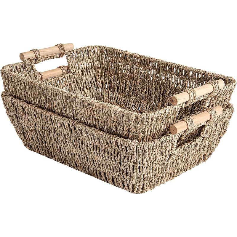 StorageWorks Hand-Woven Large Storage Baskets with Wooden Handles, Seagrass Wicker Baskets for Organizing, 2-Pack Size may vary within 1/4 inch due to handwoven design and manual measurement. Versatile storage for hand towels, toiletries, toilet paper in b