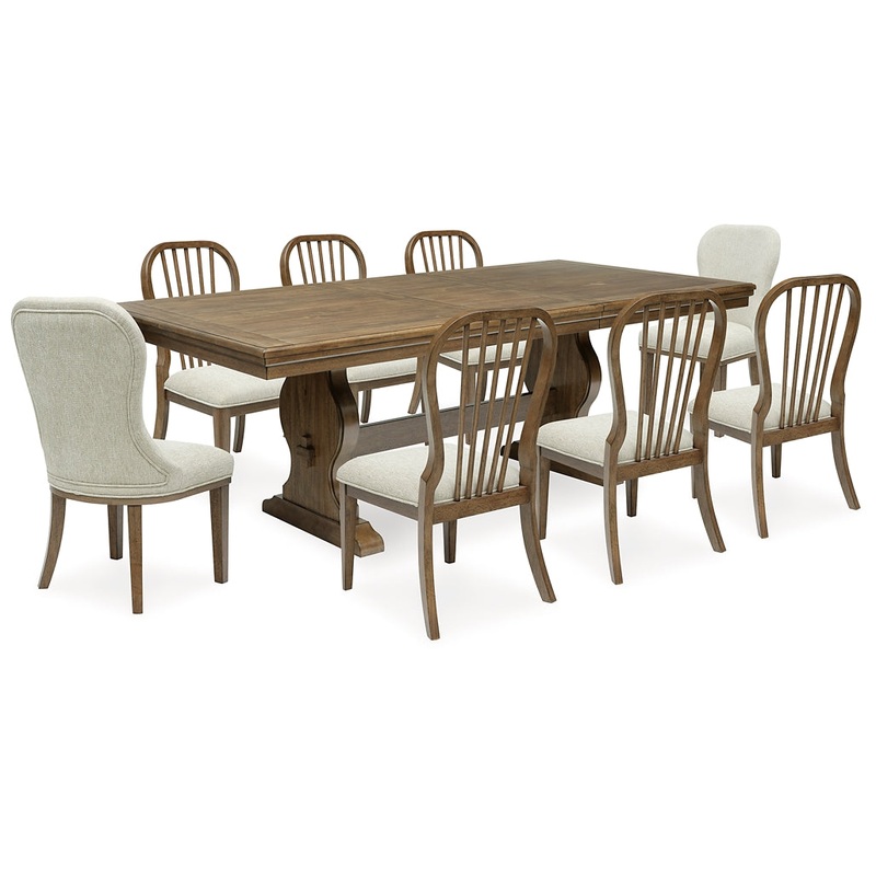 | Details | D787-35: Made with hardwood solids, veneers and MDF substrates, Brown finish, Removable center leaf, Table extends by pulling both ends and dropping in leaf, Double-pedestal trestle base with stretcher, Seats up to 8, Assembly required, D787-02: Made with solid wood frame, Frame with brown finish, Polyester upholstery, Foam cushion, Legs with adjustable levelers, Assembly required, |