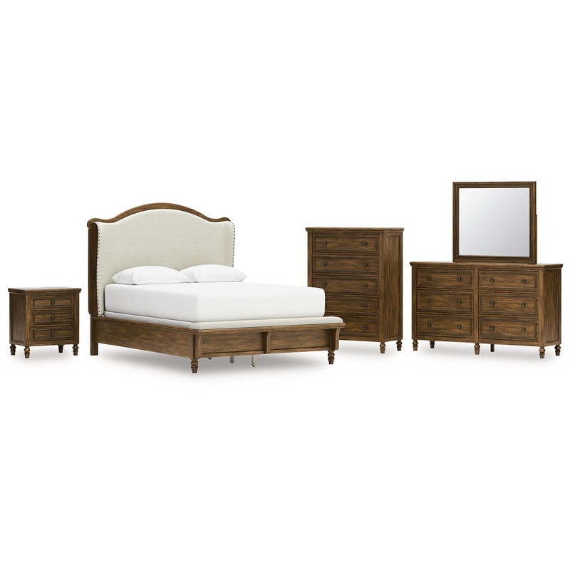 | Details | B787B2: Includes upholstered headboard, panel rails and bench footboard with slats, Made with hardwood solids, veneers and MDF substrates, Brown finish, Polyester upholstery, Nailhead trim, Turned feet, Foundation/box spring required, sold separately, Mattress available, sold separately, Assembly required, B787B1: Includes dresser and mirror, Made with hardwood solids, veneers and MDF substrates, Brown finish, Oil-rubbed bronze-tone knobs, 6 drawers with fully finished interior, dovetail construction and heavy duty ball-bearing side glides (top drawers felt lined), Turned feet, Mirror attaches to back of dresser, B787-46: Made with hardwood solids, veneers and MDF substrates, Brown finish, Oil-rubbed bronze-tone knobs, 5 drawers with fully finished interior, dovetail construction and heavy duty ball-bearing side glides (top drawer felt lined), Turned feet, B787-93: Made with hardwood solids, veneers and MDF substrates, Brown finish, Oil-rubbed bronze-tone knobs, 2 drawers with fully finished interior, dovetail construction and heavy duty ball-bearing side glides (top drawer felt lined), Turned feet, 110V power supply with USB-A and USB-C charging ports, Power cord included; UL Listed, |