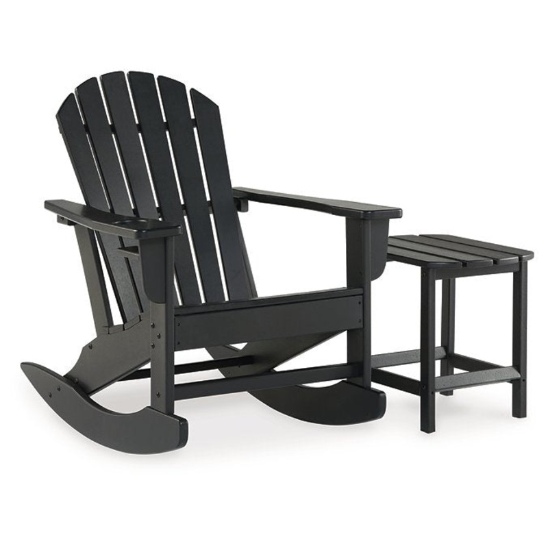 Add cottage-quaint charm to your outdoor oasis with this rocking chair and table set. Made of MEGA TUFF high-density polyethylene material, its sure to weather the seasons beautifully. Designed to shed rainwater, the slatted styling and classic Adirondack