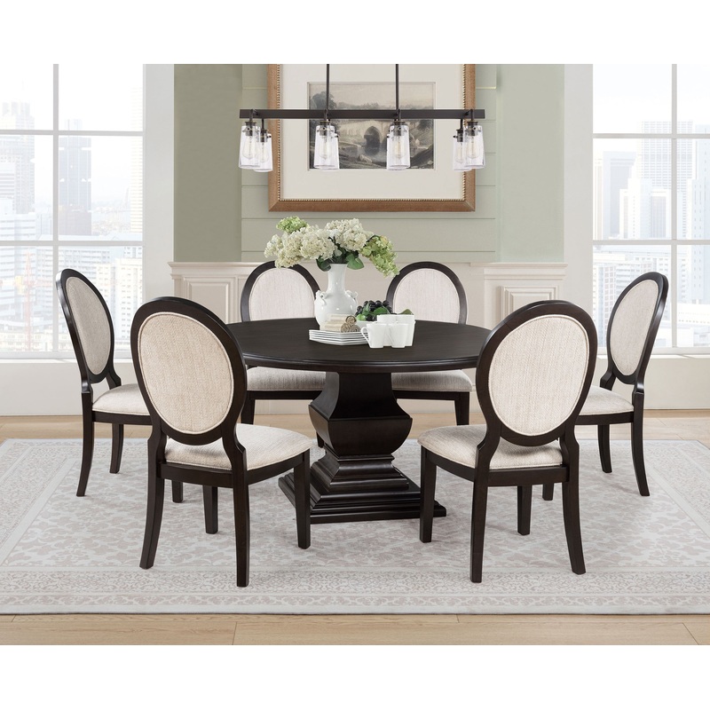 The Twyla dining set pairs a round pedestal table with oval back chairs in dark cocoa wood and cream upholstery, blending timeless elegance with everyday comfort.Bullets Dining set includes a round table and matching chairs with a rich dark cocoa wood fini