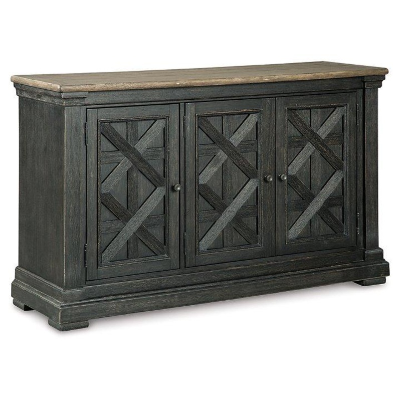 Invite your family into the heart of your home with this dining room server. Black finish is beautifully textured. Timeworn planked oak top creates a unique two-tone contrast. Charming lattice design graces the front of the doors. Store away essentials on the cabinet shelving. Thick pilasters add to the sturdiness of the foundation. This is trend-right urban farmhouse style.