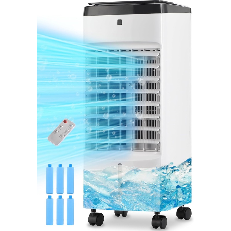 - 3-in-1 Evaporative Air Cooler: This portable air conditioner integrates the functions of blowing, humidifying, cooling all in one compact unit. 6 Ice packs enhance cooling efficiency and extend the cooling duration while optimizing energy conservation.