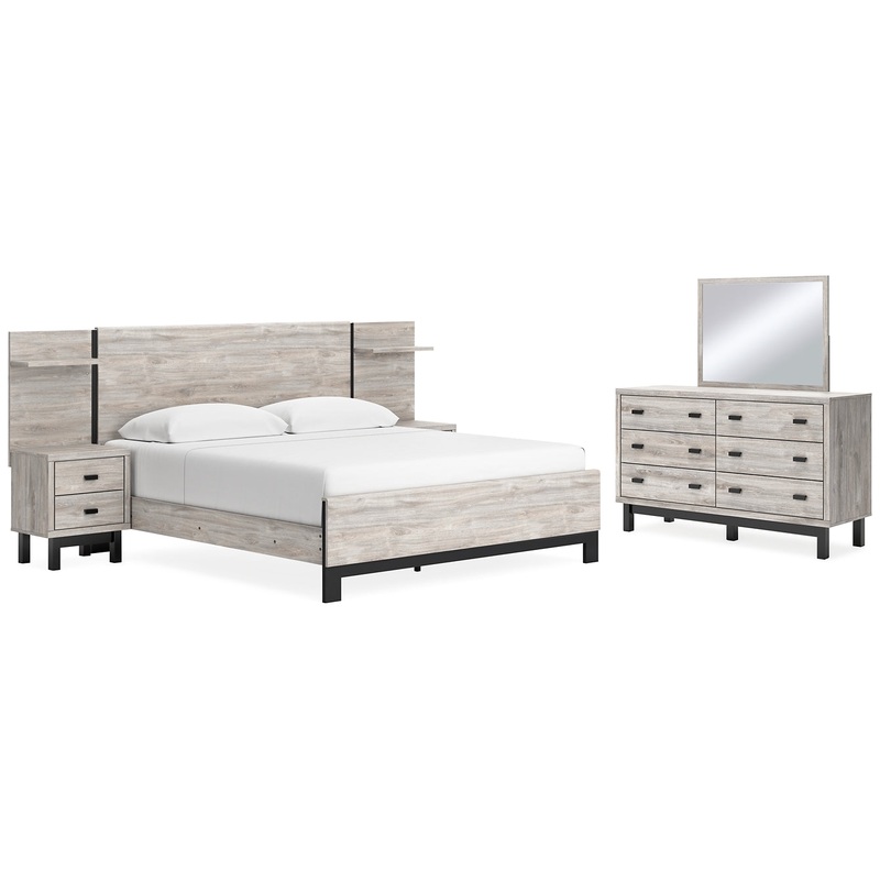 Details B1036B7: Includes king panel headboard, footboard and rails, Made with engineered wood (MDF/particleboard/plywood) and decorative laminate for the right balance of affordability and durability, Light gray finish over a replicated oak grain with authentic touch; footboard base has matte black finish with subtle replicated wood grain, Decorative laminate replicates natural or man-made material surfaces with consistent color, pattern and texture, Foundation/box spring required, sold separately, Mattress available, sold separately, Assembly required, B1036B1: Includes dresser and mirror, Made with engineered wood (MDF/particleboard/plywood) and decorative laminate for the right balance of affordability and durability, Light gray finish over a replicated oak grain with authentic touch; base has matte black finish with subtle replicated wood grain, Decorative laminate replicates natural or man-made material surfaces with consistent color, pattern and texture, Handles with matte black finish, 6 smooth-gliding drawers, Drawer interiors are lined with a faux linen laminate for a clean, finished look, Mirror attaches to back of dresser; can also be hung horizontally or vertically, Safety is a top priority, clothing storage units are designed to meet the most current standard for stability, ASTM F 2057 (ASTM International), Drawers extend out to accommodate maximum access to drawer interior while maintaining safety, Assembly required,
