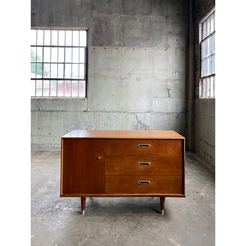 Condition: This credenza has a wood top. It is a 7.5 and in good condition with light wear from use and age. There are a couple small scuffs and some discoloration but overall it is in good condition. Please see the photos!
