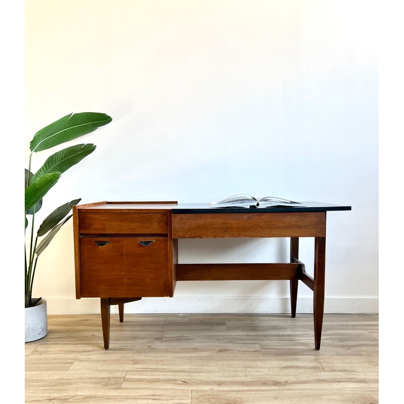 Measurements: 54 wide x 24 deep x 29.5 tallCondition: This vintage desk is a 7.5 and in good condition with light wear from use and age. There are a couple small scuffs and some discoloration but overall it is in good condition. Please see the photos!Local