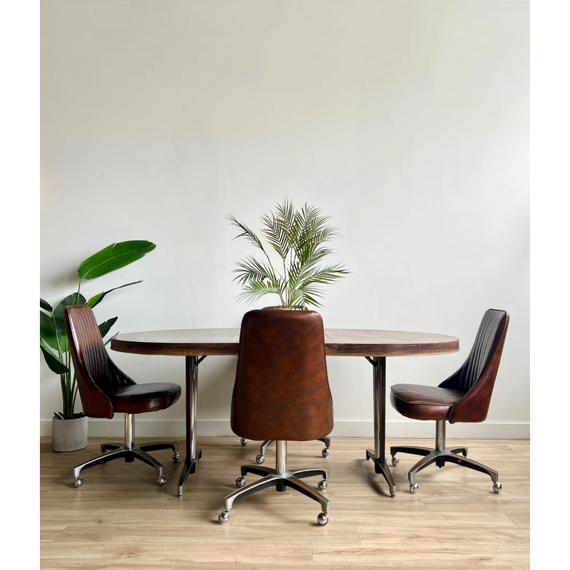 Condition: This vintage dining set is a 7.5 and in good condition with light wear from use and age. The chairs are excellent with no issues. The table has one one small repaired area. There are a couple small scuffs and some discoloration but overall it is in good condition. Please see the photos!