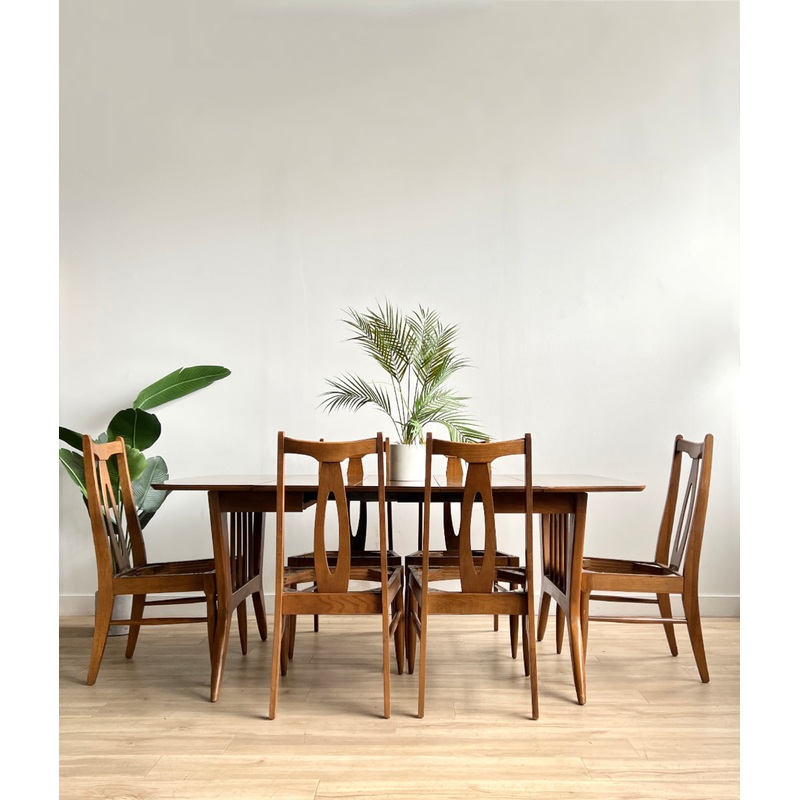 Condition: This vintage dining set includes 6 chairs with upholstery service, two leaves and a dining table. The set is an 8.5 and in good condition with light wear from use and age. There are a couple small scuffs and some discoloration but overall it is in good condition. Please see the photos!