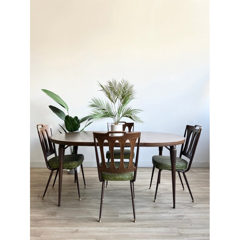 Condition: This vintage dining set is an 8 and in good condition with light wear from use and age. It includes four chairs and two leaves. There are a couple small scuffs and some discoloration but overall it is in good condition. Please see the photos!