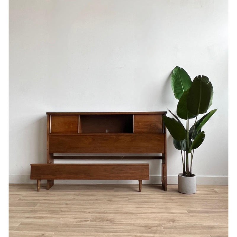 Measurements: 57.5 wide x 7 deep x 37.5 tallCondition: This vintage headboard and frame is a 7.5 and in good condition with light wear from use and age. There are a couple small scuffs and some discoloration but overall it is in good condition. Please see