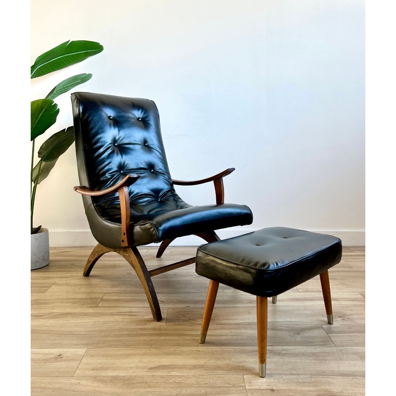 Condition: This vintage lounge chair and ottoman are freshly upholstered in black Italian leather. The legs and arms are an 8 and in good condition with light wear from use and age. There are a couple small scuffs and some discoloration but overall it is in good condition. Please see the photos!