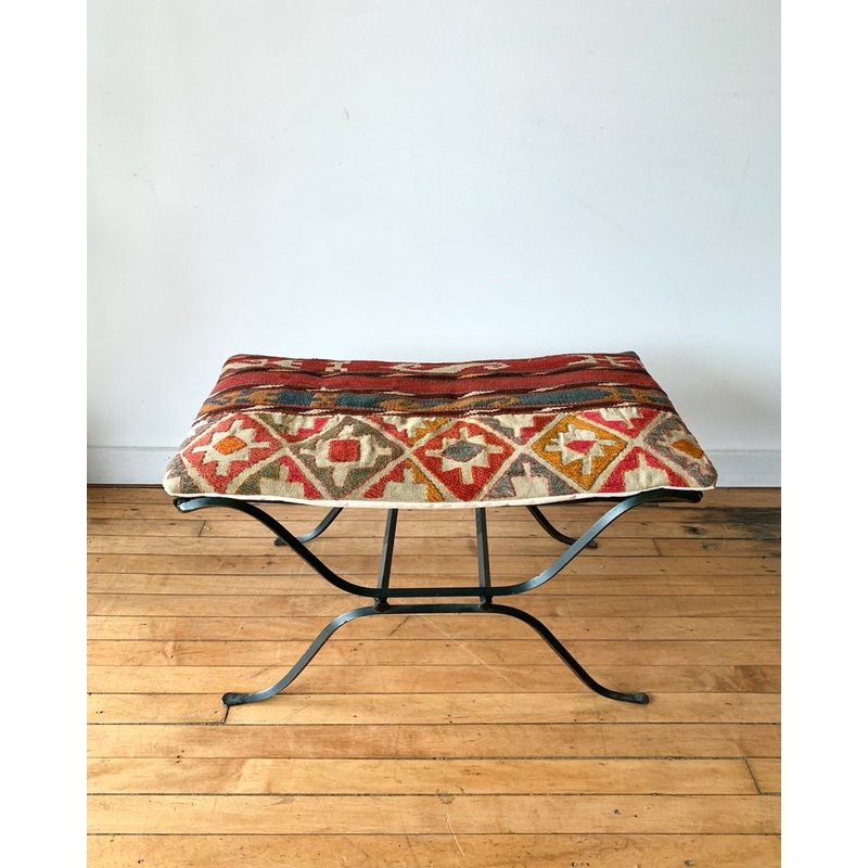 Condition: This vintage ottoman feature iron construction and is finished with a vintage Turkish flat weave cushion we upholstered here in the shop! It is in good condition with some wear from use and age.Please call 402 474 5407 with any questions or to r