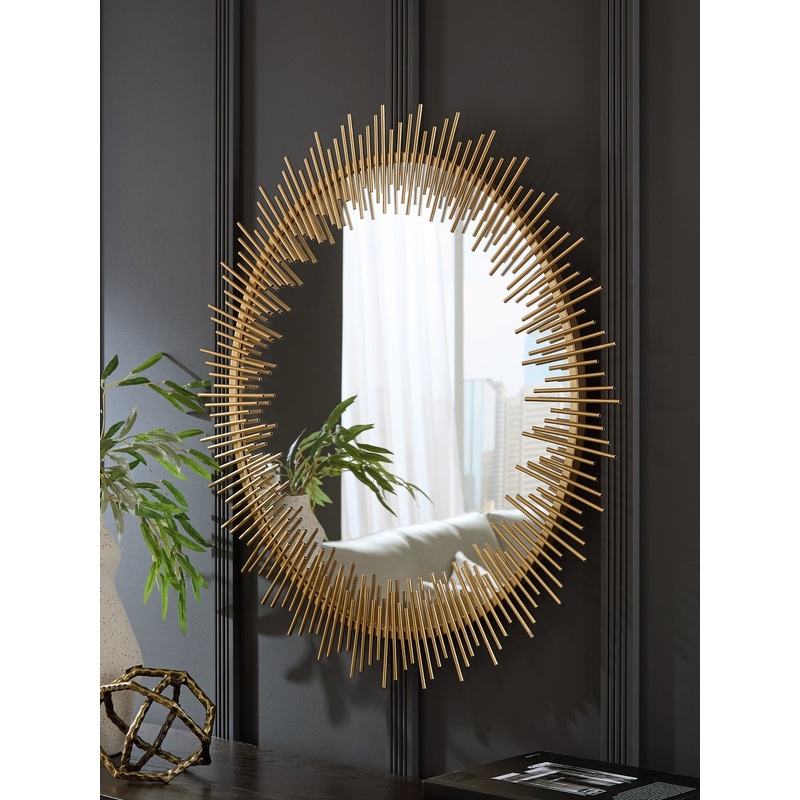 Here comes the sun. Delighting with a contemporary twist on the sunburst, this metal accent mirror is simply stunning. And with its radiating rays in a chic goldtone finish, its sure to round out your wall with bold yet sophisticated style.SpecificationsHe