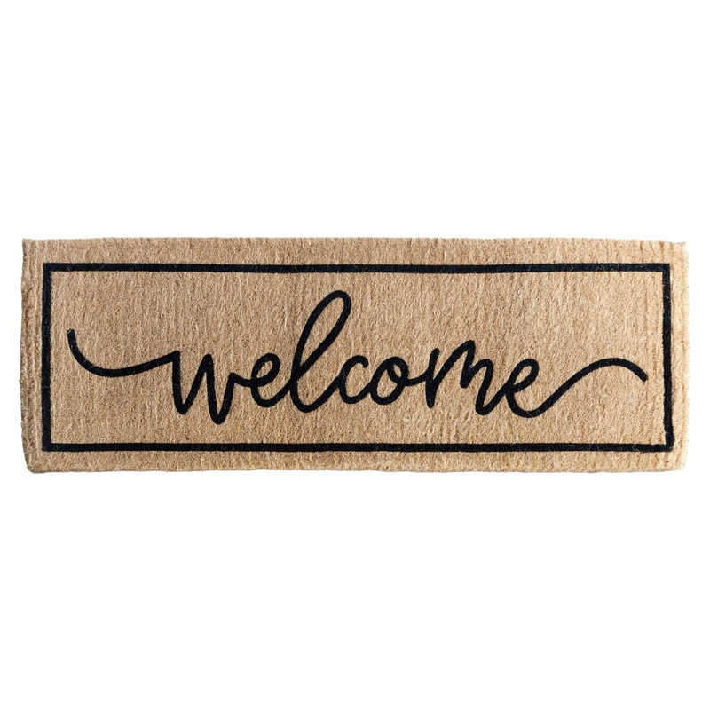 Make a stylish statement at your doorstep with the Welcome Long coir doormat. Featuring a slimline, extra-long size and minimalist Welcome print in black, this doormat adds a chic Coastal Country vibe to your entrance. Crafted from durable coir fibre with a printed finish, its perfect for keeping dirt and moisture outside while creating a warm and inviting look. The natural and black colour combination complements any home dcor, and the rectangular shape is ideal for wider doorways.