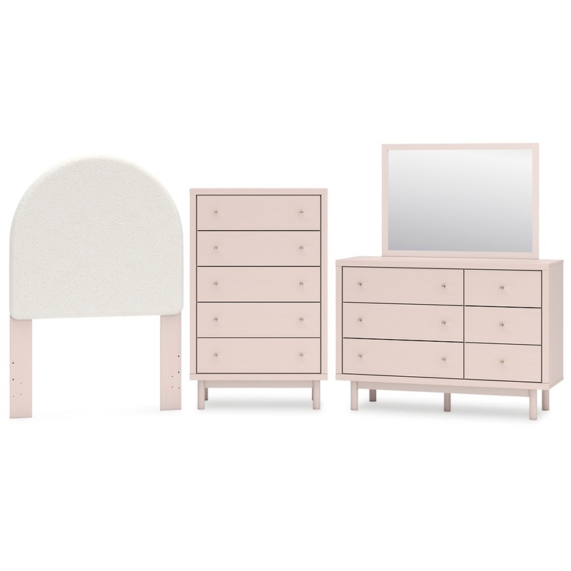 Details B1323-53: Made with durable engineered wood frame covered in a creamy white boucle, Polyester upholstery, ” bolts (not included) are needed to attach headboard to your existing bed frame, Minor assembly required, B1323-245: Made with engineered wood (MDF/particleboard/plywood) and decorative laminate for the right balance of affordability and durability, Subtle blush finish over replicated pecan wood grain, Decorative laminate replicates natural or man-made material surfaces with consistent color, pattern and texture, Champagne colored knobs, 5 smooth-gliding drawers, Drawer interiors are lined with a faux linen laminate for a clean, finished look, Safety is a top priority, clothing storage units are designed to meet the most current standard for stability, ASTM F 2057 (ASTM International), Drawers extend out to accommodate maximum access to drawer interior while maintaining safety, Minor assembly required, B1323B1: Includes dresser and mirror, Made with engineered wood (MDF/particleboard/plywood) and decorative laminate for the right balance of affordability and durability, Subtle blush finish over replicated pecan wood grain, Decorative laminate replicates natural or man-made material surfaces with consistent color, pattern and texture, Champagne colored knobs, 6 smooth-gliding drawers , Drawer interiors are lined with a faux linen laminate for a clean, finished look, Mirror can be attached to back of dresser or wall mounted horizontally or vertically, Safety is a top priority, clothing storage units are designed to meet the most current standard for stability, ASTM F 2057 (ASTM International) , Drawers extend out to accommodate maximum access to drawer interior while maintaining safety, Minor assembly required,