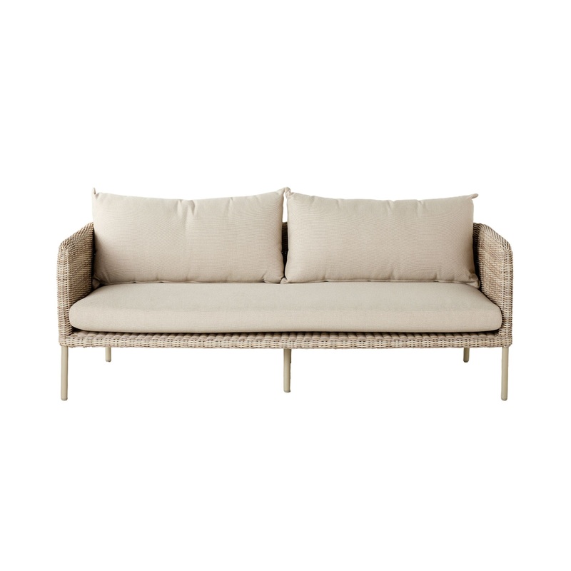 Transform your living space with the Wren 2.5 Sofa, a wicker outdoor couch designed to suit both compact balconies and larger entertaining areas. Built with a sturdy metal frame and woven wicker in a natural finish, its complemented by stone-coloured, mois