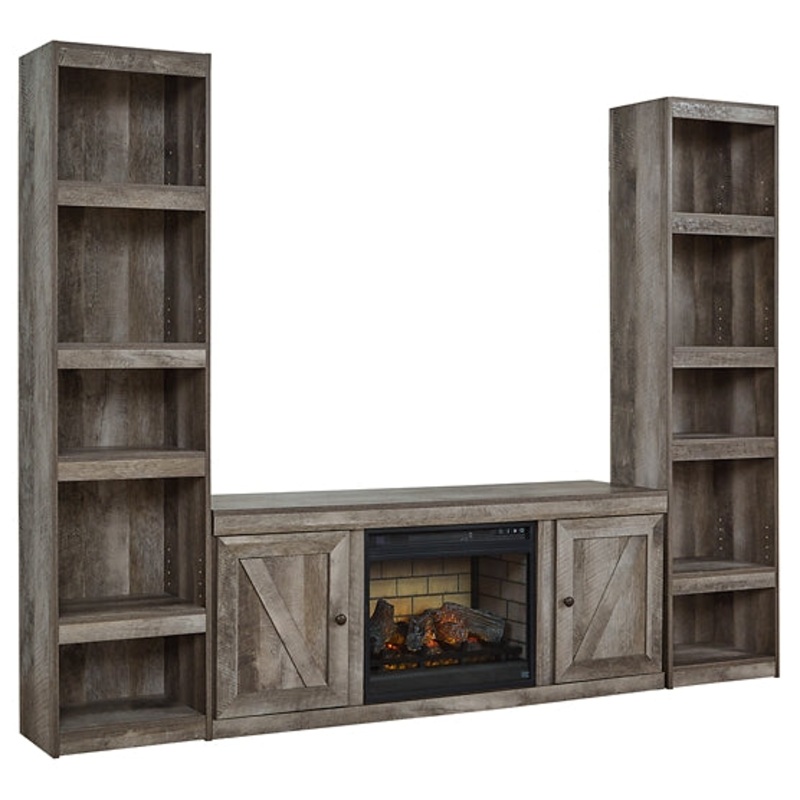 | Details | Includes TV stand, 2 piers and fireplace insert, Made with engineered wood (MDF/particleboard) and decorative laminate, Gray planked replicated oak grain with authentic touch, TV stand has 2 storage cabinets and 1 open display space (with removable/adjustable shelf), Round knobs and hooded pulls in dark bronze-tone finish, Cutouts for wire management and ventilation, Each pier has 4 shelves (3 adjustable), Electric fireplace insert provides up to 5,386 BTU/1,500W and warms up to 1,000 square feet (heats larger rooms), 7-level temperature setting; 5 levels of flame brightness; LED-lit multi flame display operates with or without infrared heat; realistic-looking log set with dynamic glowing embers, Remote control with LED display, Timer function with programmable ranges from 10 minutes to 9 hours; overheating control device, Power cord included; UL Listed, Assembly required; simply remove the center shelf and back panel to make room for the fireplace insert |